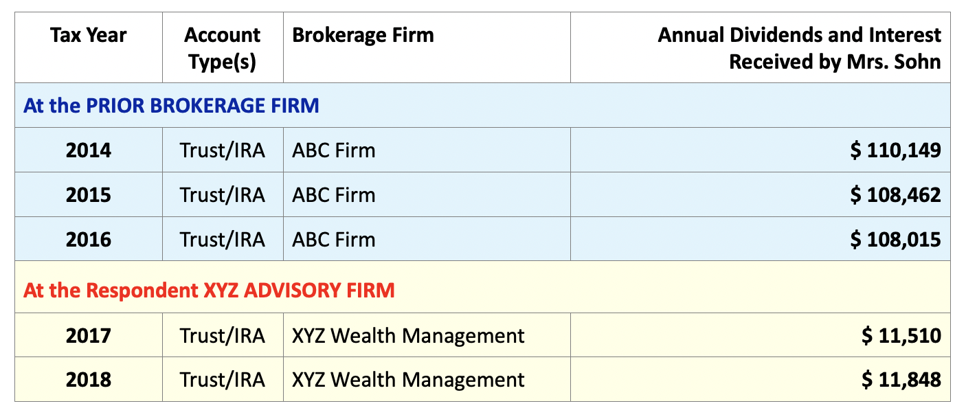 Examples of types of tables appropriate for inclusion in a Statement of Claim include those two below. These tables related to a case where, like often is the case, the client transferred their portfolio from Firm A to Firm B. Thereafter, the financial advisor at Firm B convinced the client to sell her blue-chip stocks and reallocate the funds into new securities—which were unsuitable for the client—selected by the new advisor. The reconstruction also resulted in a severe depletion of dividend and interest income for the client.